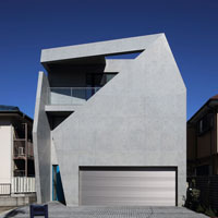 一見閉鎖的な外観ですが、内部から見ると適度にプライバシーを確保しつつ、十分な開放感が得られるようになっています。建物の外形は法規から自然に導かれた多面体のボリュームをベースとし、壁や屋根の切り欠き形状を恣意的に操作することで特徴的なファサードを作り出しています。外壁仕上げはコンクリート打放し。傾斜している部分など、一部汚れが心配される形状であることから、高性能な光触媒コーティングによる防汚対策を施しています。