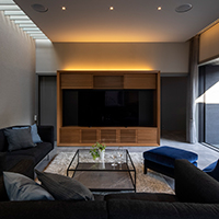 計画敷地が約130坪と纏まった面積で、高低差のある条件であった事から、鉄筋コンクリート造による4台分の並列駐車場を道路レベルに配置。上階には平屋の木構造にて、中央に中庭を持つ『ロの字型コートハウス』型の居住スペースを設ける混構造計画としました。