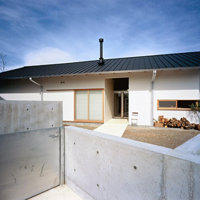 変形地であったが、敷地北側が公園に面していた為、アプローチから玄関部分、さらに公園に至るまで、屋根の下を貫通するように配置し、その東西に夫々、アトリエ及び住居部分を配し、全体を覆うように薄くシャープな切妻の大屋根を架けました。