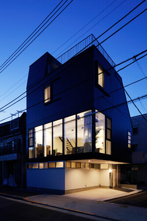 東京都内のご夫婦のための住宅です。南側の道路を挟んだ向かいは公共施設で引きがたっぷりあり、面積は大きくないものの都心の密集地とは異なる広がり感のある敷地だったため、それを生かして計画を進めました。7m角のほぼ正方形の建物を建築面積いっぱいに配置、1階にエントランスと和室、2階は天井の高いワンルームのLDK、3階に寝室とバス空間、とシンプルな構成で、敷地をフル活用し生活空間を立体的に確保しています。プライバシーに重きを置く1階と3階は開口を絞り、2階のLDKは外へ向かって開放的に、そして屋上ではパノラマ風景が広がる、といった具合に、建物を移動するたびに閉→開→閉→開…とシーンが展開する住宅です。
